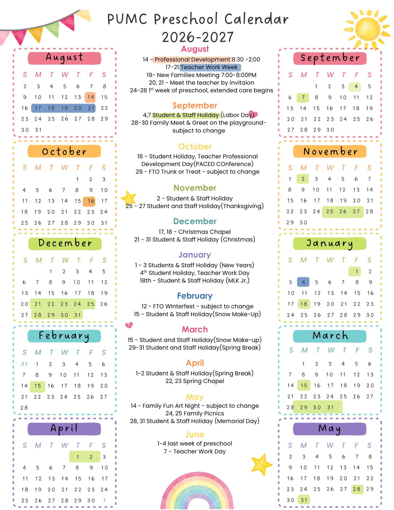 Classes are held from August through May with Summer Fun Camps offered for several weeks in the summer. Morning preschool hours are 9 AM to 12 PM but many options are available for Early Drop Off, Extended Session, and Extended Care that make a day from 7:45 AM to 4:30 PM possible.